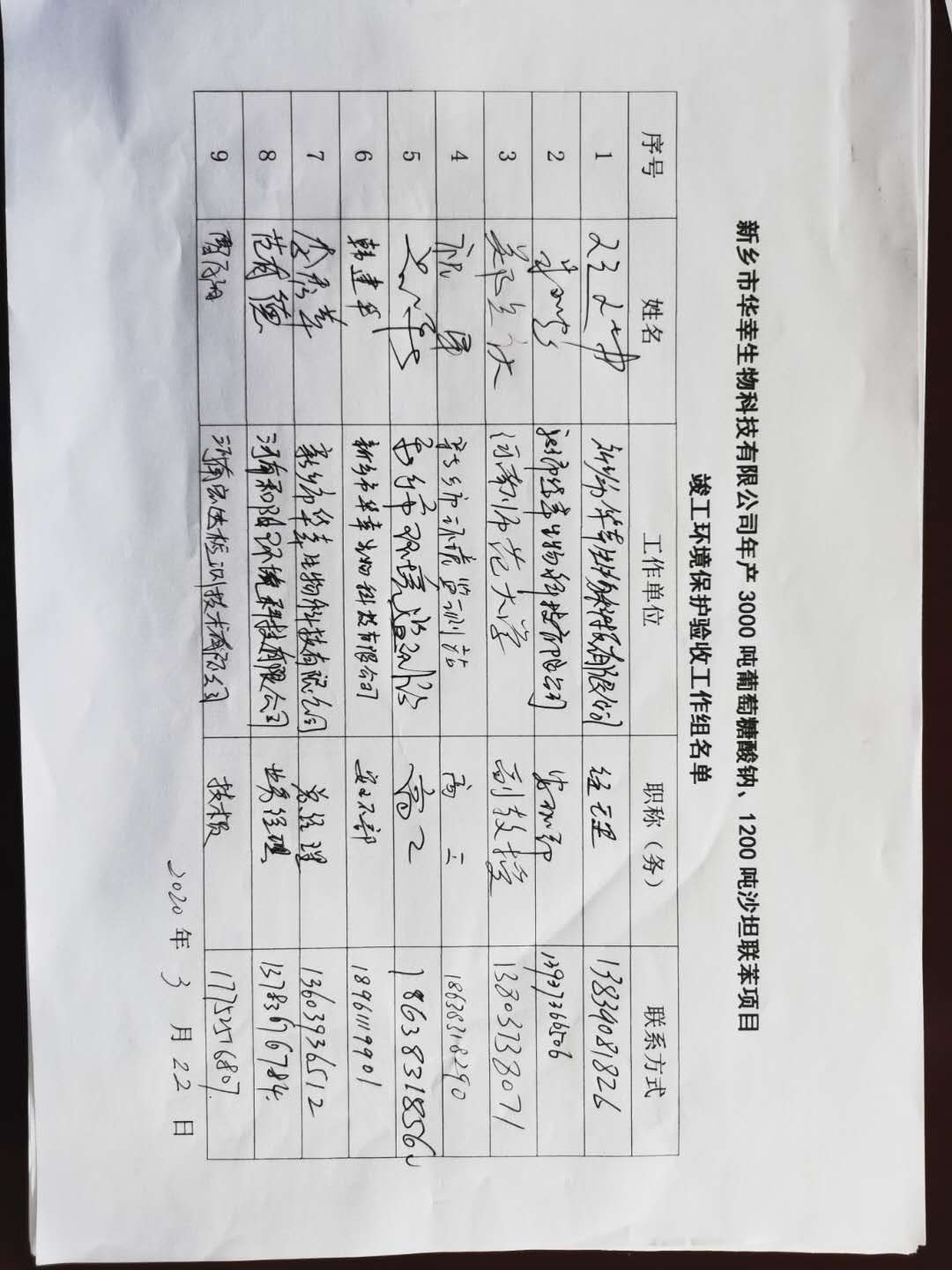 依據(jù)國務(wù)院第682號文頒布的新《建設(shè)項目環(huán)境保護管理條例》和原環(huán)境保護部國環(huán)規(guī)環(huán)評[2017]4號文公告的《建設(shè)項目竣工環(huán)境保護驗收暫行辦法》的相關(guān)要求,新鄉(xiāng)市華幸生物科技有限公司于2020年1月20日在新鄉(xiāng)市華幸生物科技有限公司廠區(qū)召開會議,對新鄉(xiāng)市華幸生物科技有限公司年產(chǎn)30000噸葡萄糖酸鈉、1200噸沙坦聯(lián)苯項目進行竣工環(huán)境保護驗收。會議成立了驗收工作組,成員由建設(shè)單位新鄉(xiāng)市華幸生物科技有限公司、驗收檢測單位河南和陽環(huán)境科技有限公司、河南宏達檢測技術(shù)有限公司的代表及邀請的技術(shù)**組成(驗收工作組名單附后)。會前,驗收工作組成員對工程主要生產(chǎn)設(shè)施、環(huán)保設(shè)施進行了現(xiàn)場檢查,會議聽取了建設(shè)單位關(guān)于項目建設(shè)情況及竣工環(huán)保工作的情況介紹、竣工環(huán)保驗收監(jiān)測報告編制單位關(guān)于驗收監(jiān)測工作技術(shù)匯報,查閱了竣工環(huán)保驗收監(jiān)測報告,核實了有關(guān)資料。經(jīng)過認(rèn)真審議與討論,形成如下驗收意見:
